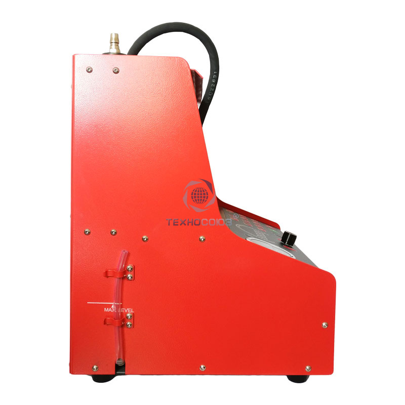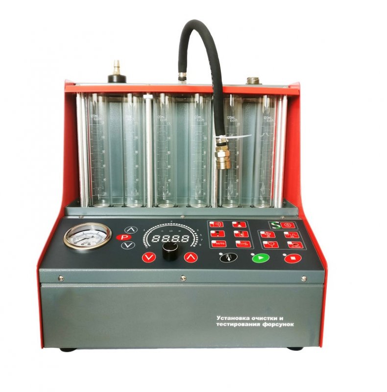 Стенд для проверки и промывки 6 инжекторов в ультразвуковой ванне. Автоматический слив тестирующей жидкости. Работает от сжатого воздуха. Имитация работы форсунок происходит с помощью встроенного электронного блока управления форсунками. В комплект поставки входит ультразвуковая ванна объемом 2,0 литра с подогревом и мощностью генератора 60 ВТ.