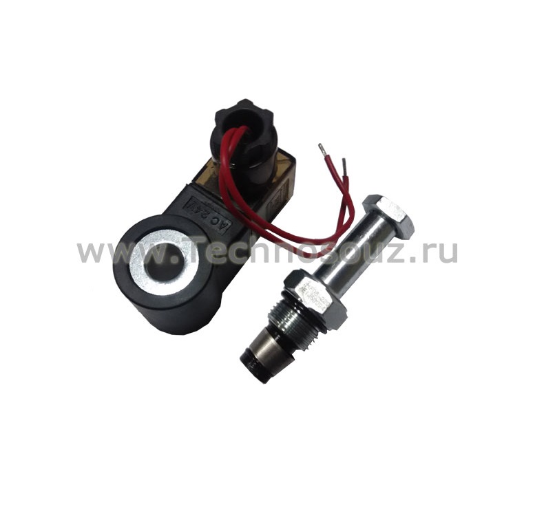 Клапан соленоидный с катушкой предназначен для управляемого стравливания давления из гидравлической системы путем сброса масла из гидроцилиндров обратно в масляный бак, тем самым производит опускание автомобиля на подъемнике.